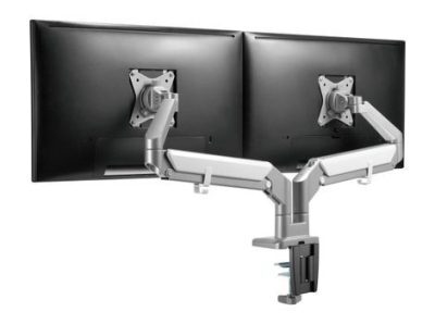Erittäin tukeva näytönvarsi kahdelle näytölle. Kaasujousellinen kolminivelinen varsi molemmissa varsissa. Asennus joko pöydänreunaan tai läpivientinä.
